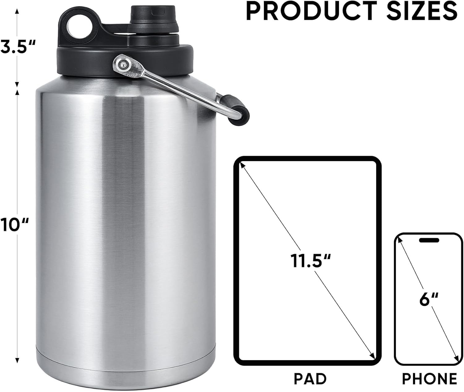 - 💧VACUUM INSULATED: Double layer vacuum insulated kettle, keeps the liquids icy for up to 48 hours or piping hot for up to 24 hours.This gallon water bottle is made of Powder-coat sweat-free technology, bottle grabbing becomes easy in time after strenuous exercise.